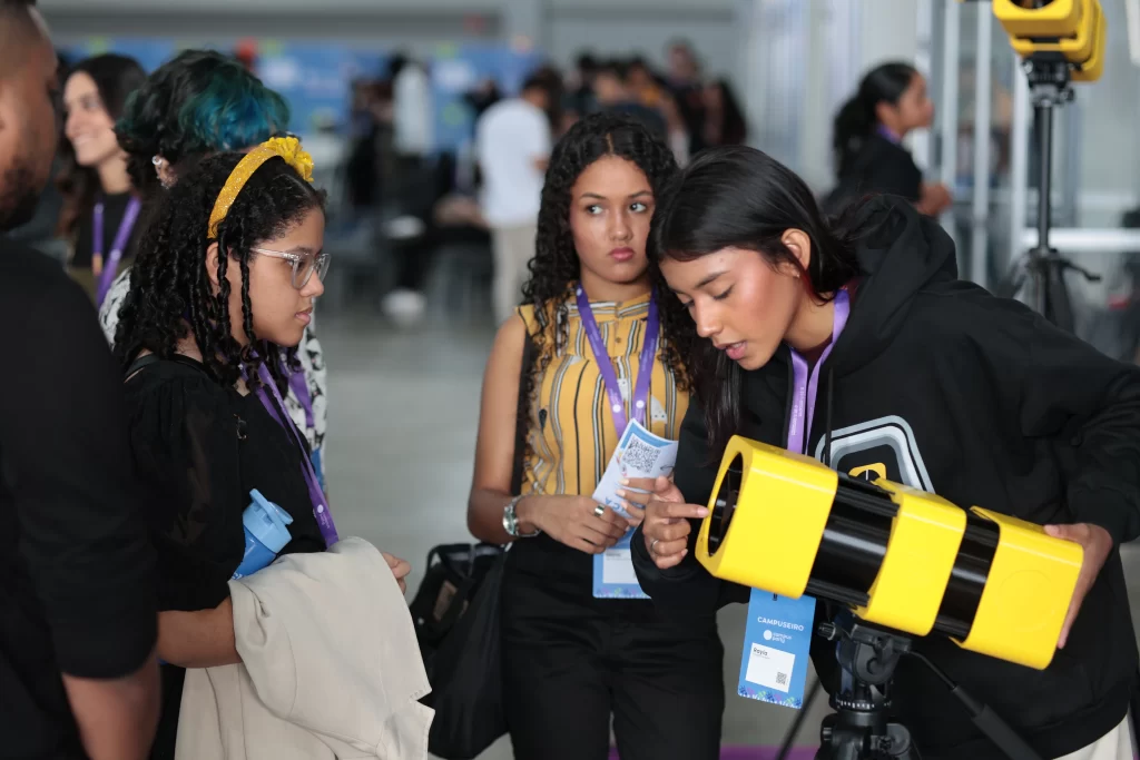 Aluna do CETI Profª Julia Nunes Alves de Teresina no Piauí, apresenta o Telescópio Saturn Janis I para visitantes do estande durante a Campus Party Weekend 2025.